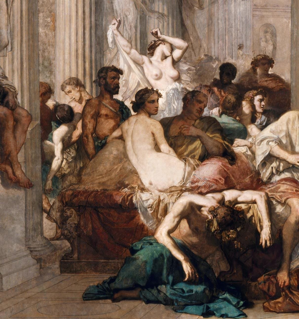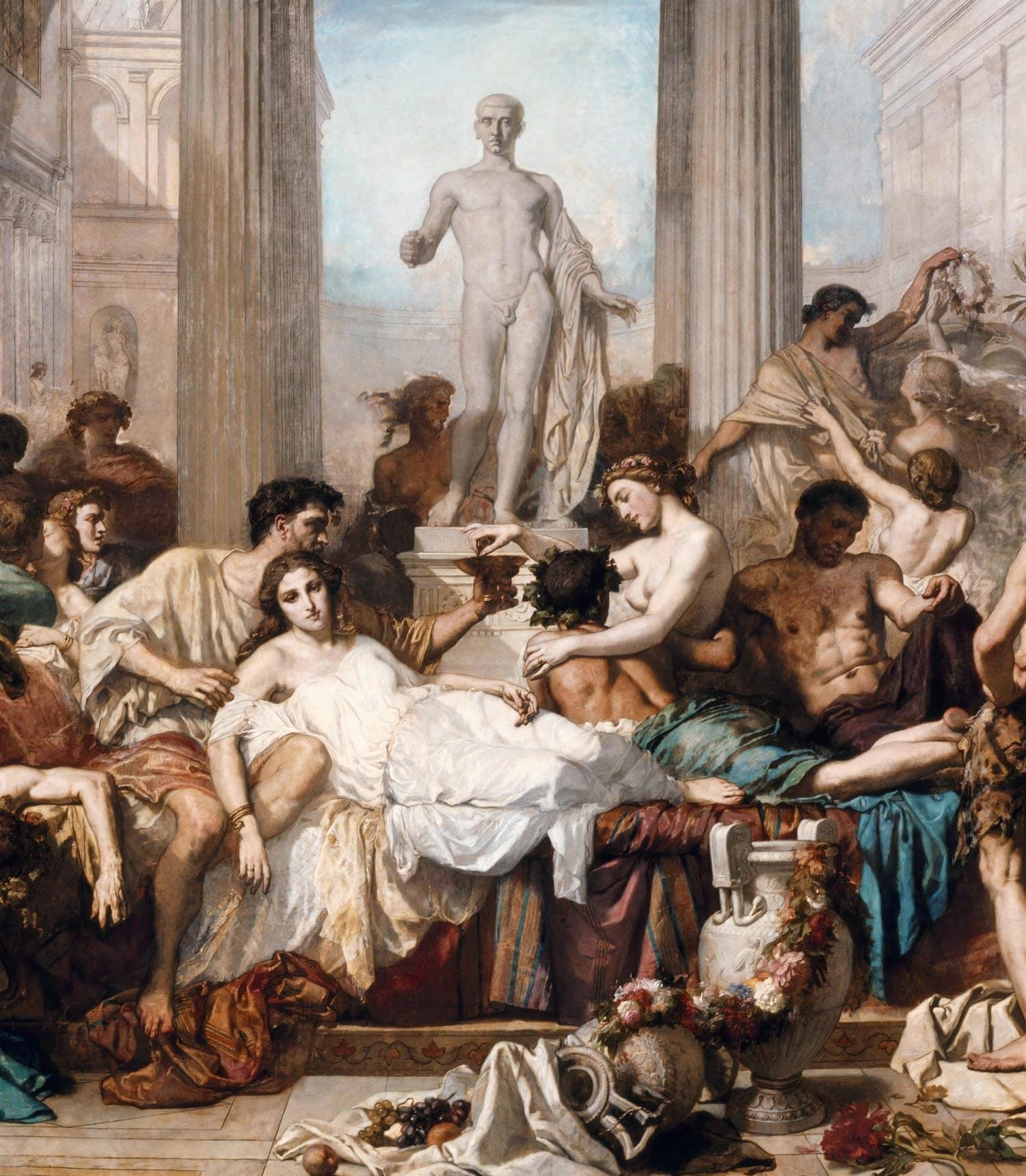 La pintura muestra una escena colectiva situada en una Roma tardía imaginada, concebida como alegoría más que como reconstrucción histórica. En un interior clásico de columnas y mármoles, los cuerpos aparecen entregados al exceso, al ocio y al agotamiento. No hay acción central ni relato heroico: la escena está dominada por la dispersión, la pasividad y la pérdida de energía. La arquitectura permanece sólida y ordenada, pero los personajes revelan una civilización que ha perdido su impulso interno. La decadencia no se expresa como ruina material, sino como desgaste moral.