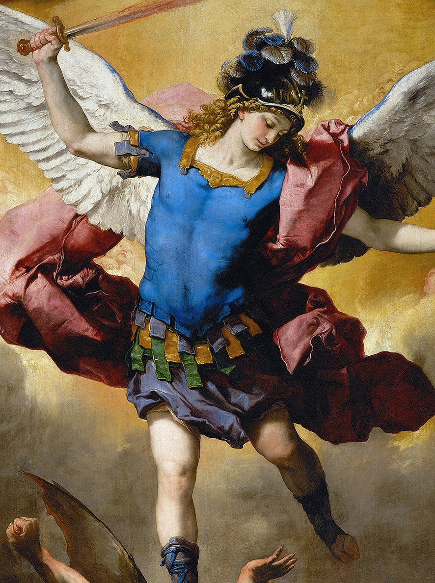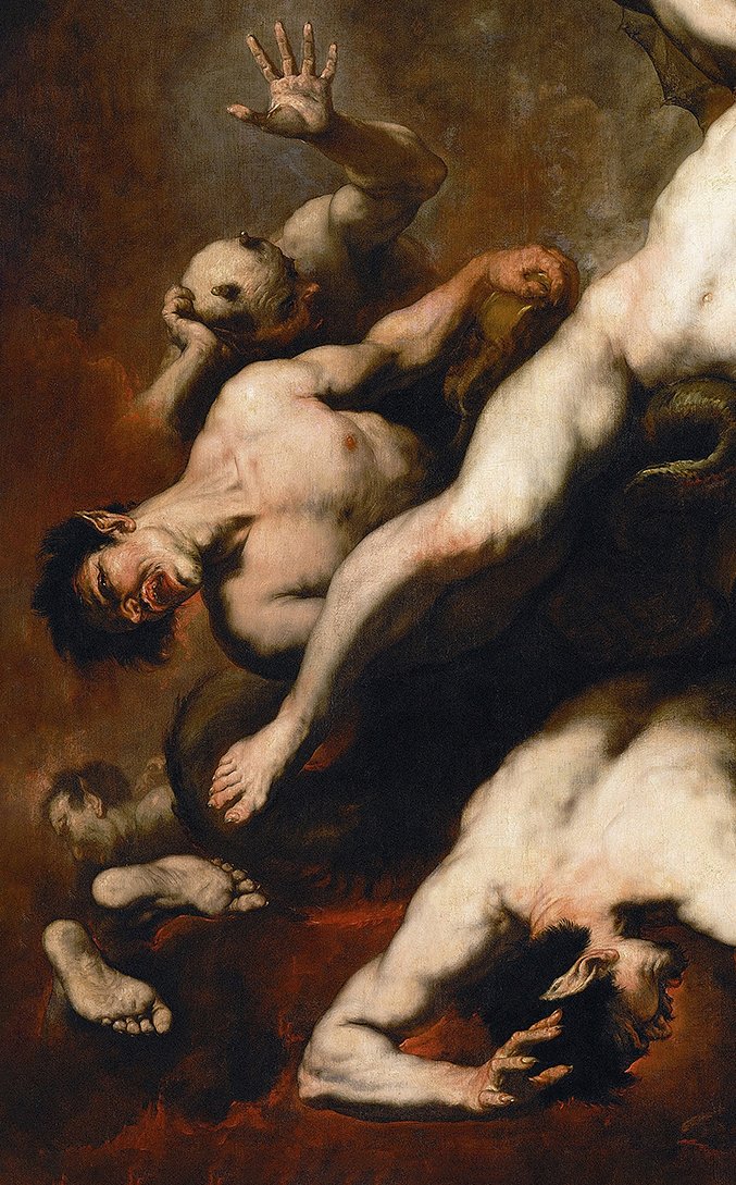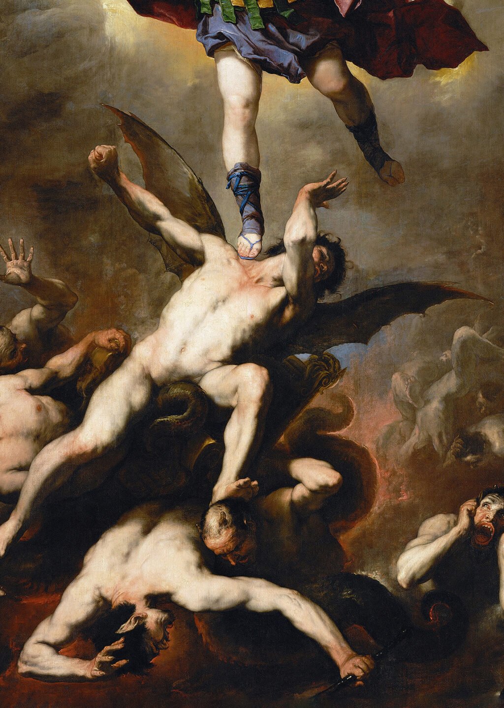 El rigor curatorial se concentra en la anatomía de la derrota: cuerpos retorcidos, deformes, precipitados en espiral hacia la sombra. Esa fealdad no es casual, sino un argumento moral y teológico que Giordano utiliza para escenificar la caída inevitable de quienes desafían la ortodoxia. Frente a ellos, el Arcángel Miguel aparece sereno, luminoso e inmune al caos, encarnando la belleza asociada al orden legítimo. El claroscuro intensifica el vértigo de la expulsión y produce un contraste psicológico absoluto: la claridad del triunfo frente a la oscuridad del error. La composición entera opera como un dispositivo persuasivo que declara, sin ambigüedades, la victoria del dogma sobre la insurrección espiritual.