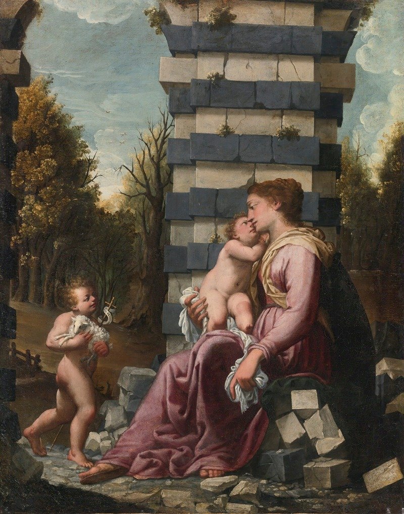 Madonna y Niño con el Niño San Juan Bautista, entre ruinas arquitectónicas, con un paisaje al fondo (c. 1600)