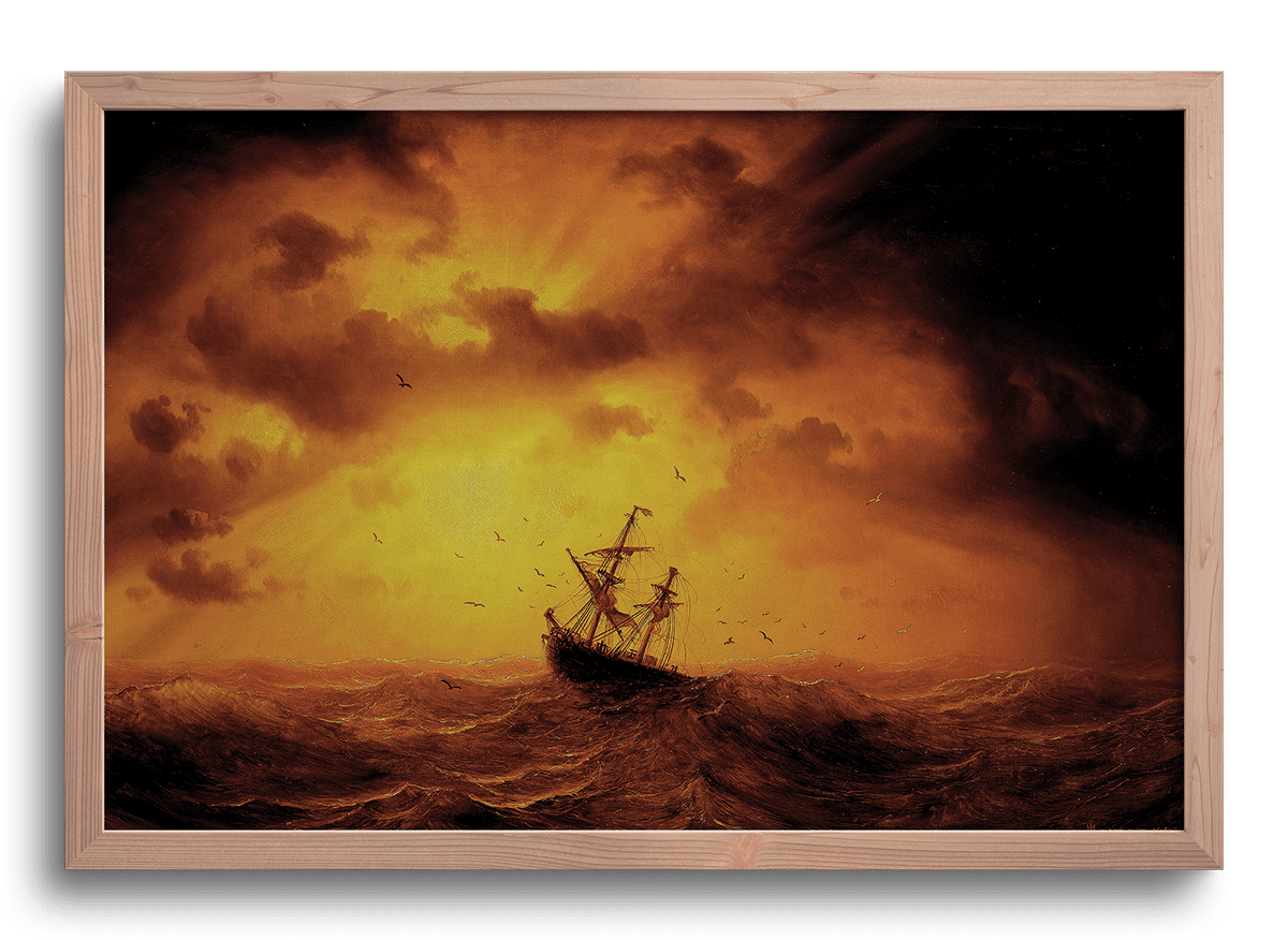 Esta pintura dramática de Marcus Larson captura un momento de furia desatada sobre el mar: olas agitadas, cielo cargado y una atmósfera que transmite tanto peligro como admiración por la naturaleza indomable. El lienzo se inscribe en la tradición romántica de representar el mar como símbolo de lo sublime: algo bello pero aterrador, más allá del control humano. En este Mar tempestuoso, Larson utiliza una paleta oscura y pinceladas cargadas para intensificar el movimiento, generando una tensión visual que empuja al espectador hacia el abismo de la escena.