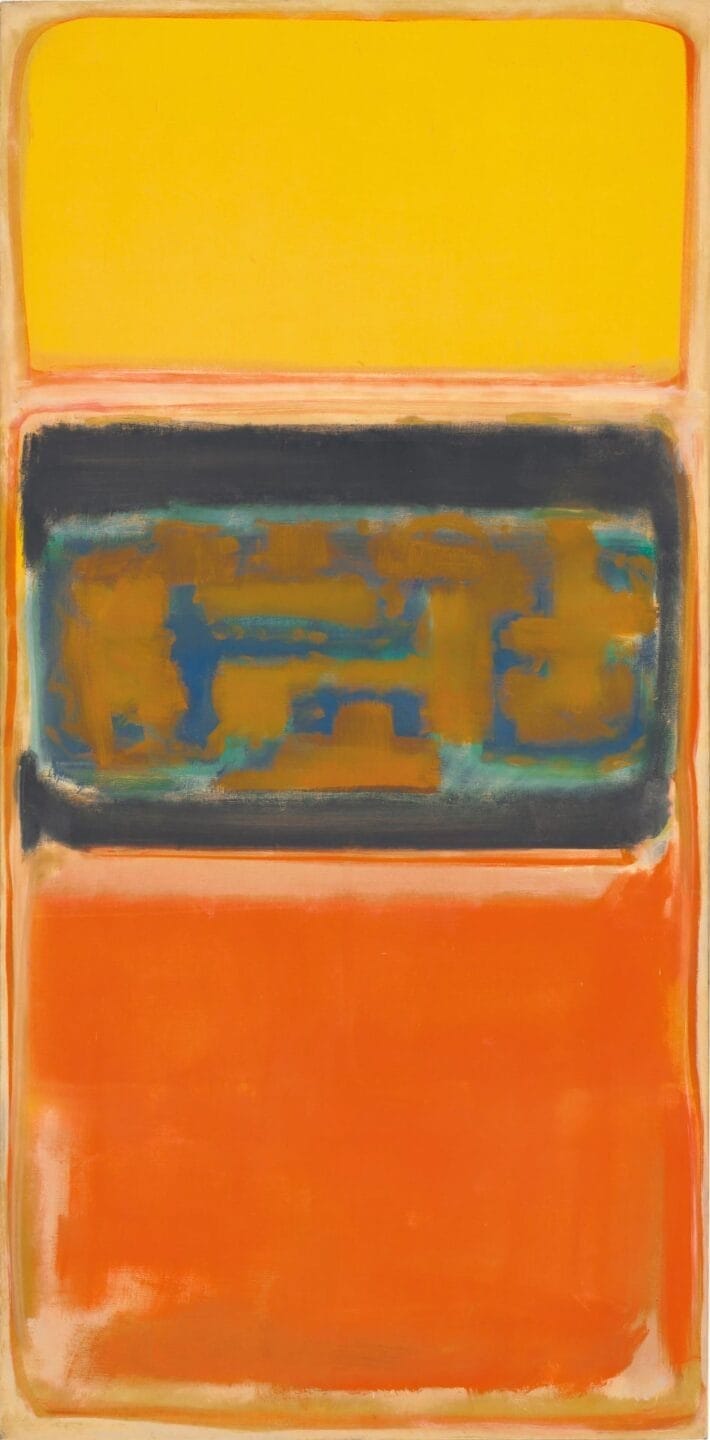 Marcus Rothkowitz (1903-1970) conocido como Mark Rothko fue un pintor y grabador nacido en Letonia que vivió la mayor parte de su vida en los Estados Unidos. Ha sido asociado con el movimiento contemporáneo del expresionismo abstracto a pesar de que en varias ocasiones expresó su rechazo a la categoría alienante de pintor abstracto. En 1925 inició su carrera como pintor en Nueva York de modo autodidacta. En torno a 1940 realizaba una pintura muy similar a la obra de Barnett Newman y Adolph Gottlieb próxima al surrealismo y plagada de formas biomórficas. A partir de 1947 su estilo cambió y comenzó a pintar grandes cuadros con capas finas de color. Con el paso de los años la mayoría de sus composiciones tomaron la forma de dos rectángulos confrontados y con bordes desdibujados por veladuras. Son frecuentes los grandes formatos que envuelven al espectador con la finalidad de hacerle partícipe de una experiencia mística ya que Rothko daba un sentido religioso a su pintura. Al final de su vida sus cuadros son de tonalidades oscuras con abundancia de marrones violetas granates y sobre todo negros. Corresponde a esta época la Capilla Rothko de la familia De Menil en Houston un espacio de oración donde catorce cuadros rodean un espacio octogonal dedicado a la meditación.