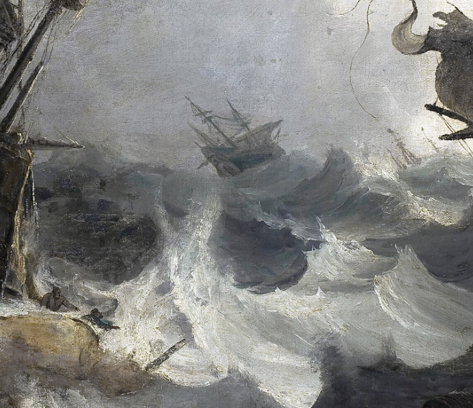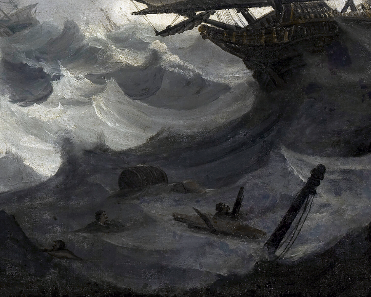Naufragio representa una escena de tormenta en alta mar, con barcos al borde del colapso, olas encrespadas y una atmósfera cargada de dramatismo. La luz violenta que se filtra entre las nubes acentúa el contraste entre la oscuridad del agua y los blancos espumosos que golpean los cascos. No hay héroes ni figuras redentoras: sólo barcos desarmados, mástiles rotos y una naturaleza desatada que encarna el límite de lo humano. Lejos de ser un mero espectáculo visual, esta obra funciona como meditación sobre la fragilidad de la existencia y el poder absoluto de las fuerzas naturales. Backhuysen, con su dominio del claroscuro atmosférico, logra una composición de energía contenida, donde cada trazo del pincel parece formar parte de una tempestad real.