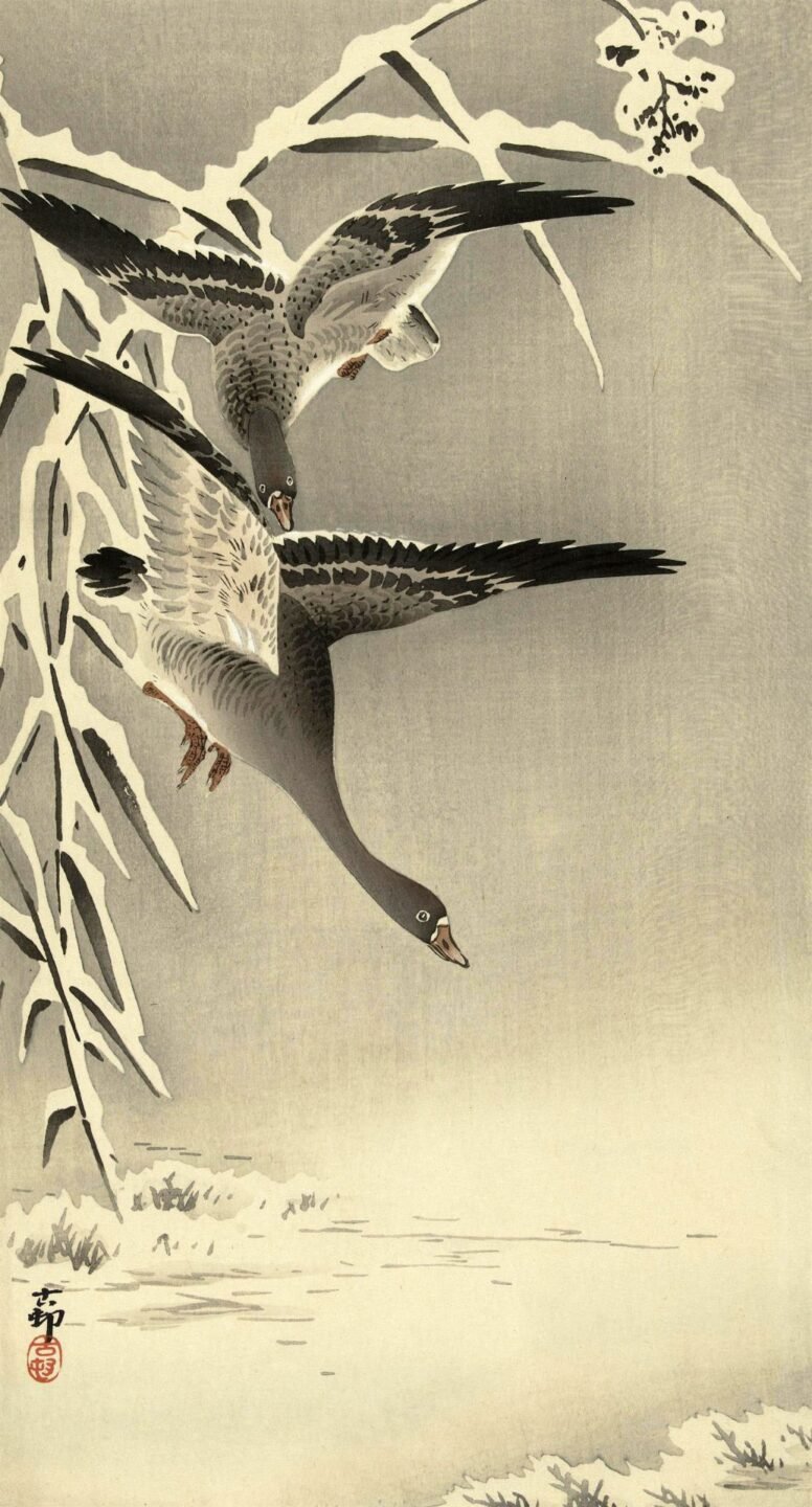 A diferencia de otros artistas del período, Koson trabajó en un contexto en el que el arte japonés buscaba reposicionarse globalmente después de la apertura del país al comercio internacional en la era Meiji. A lo largo de su carrera, sus grabados evolucionaron desde un estilo más académico hacia formas más libres, mostrando la influencia del Art Nouveau y la estética occidental. Muchas de sus obras fueron distribuidas en Occidente gracias a su colaboración con editores como Watanabe Shozaburo, quien fue instrumental en el renacimiento del Shin-hanga. Su arte, por tanto, no solo representa un puente entre épocas y estilos, sino que también simboliza el diálogo cultural entre Japón y Occidente durante un período de profundos cambios artísticos y sociales. La habilidad de Koson para capturar la quietud de la naturaleza y la esencia de cada criatura ha convertido a sus grabados en piezas muy valoradas en el mercado del arte, apreciadas por su técnica impecable y su atmósfera de serenidad introspectiva.