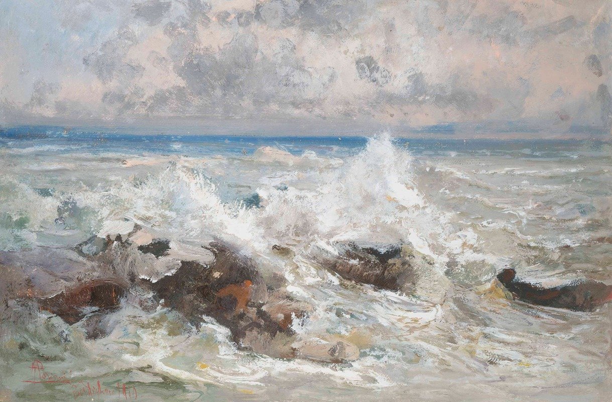 Olas rompiendo contra las rocas en Bordighera (1919)