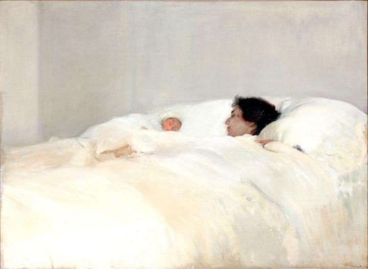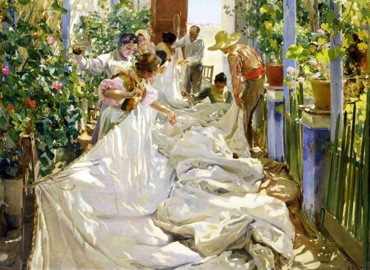 La pintura ‘Paseo a orillas del mar’ muestra a la esposa e hija de Sorolla caminando por la playa de Valencia. Con un dominio excepcional de la luz y el color, el artista captura el movimiento del viento y la atmósfera luminosa del momento. Los vestidos blancos ondeando, el reflejo del sol en el agua y la arena crean una escena de serenidad y belleza que caracteriza el estilo vibrante de Sorolla.