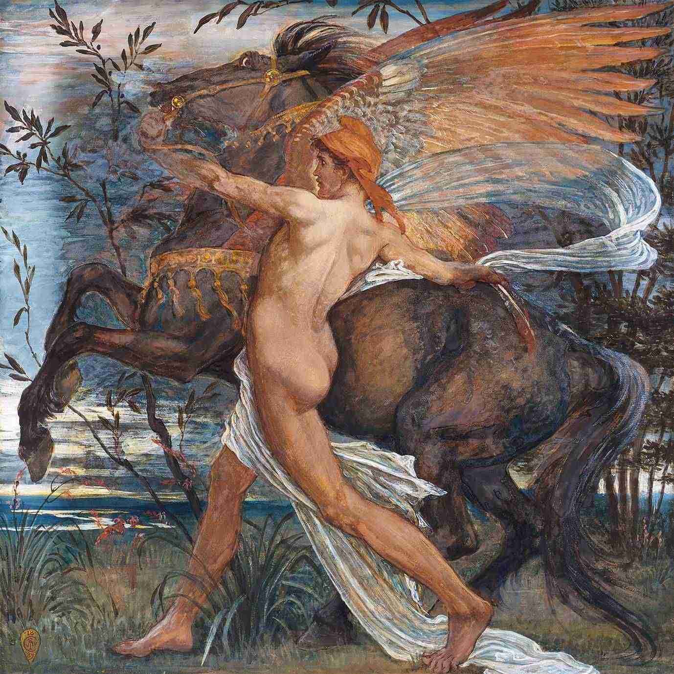 Walter Crane, uno de los grandes exponentes del movimiento Arts and Crafts, capturó en su obra Pegaso (1889) la esencia mitológica del caballo alado en una composición que fusiona la estética decorativa con la narrativa heroica. Influenciado por el simbolismo y el idealismo romántico, Crane dotó a Pegaso de una presencia casi etérea, enmarcada en un estilo ornamental que evoca tanto la tradición clásica como el detallismo minucioso del arte prerrafaelita. La obra refleja la fascinación de la época victoriana por los mitos grecolatinos, pero también su inclinación por la estilización de la figura y el diseño gráfico, elementos que Crane dominaba a la perfección como ilustrador. En esta pintura, Pegaso parece surgir del Olimpo mismo, su postura imponente y su crin al viento simbolizan la libertad del espíritu y la elevación del arte por encima de lo mundano. Es un homenaje a la creatividad y la inspiración, atributos que la figura de Pegaso ha representado a lo largo de la historia del arte y la literatura.