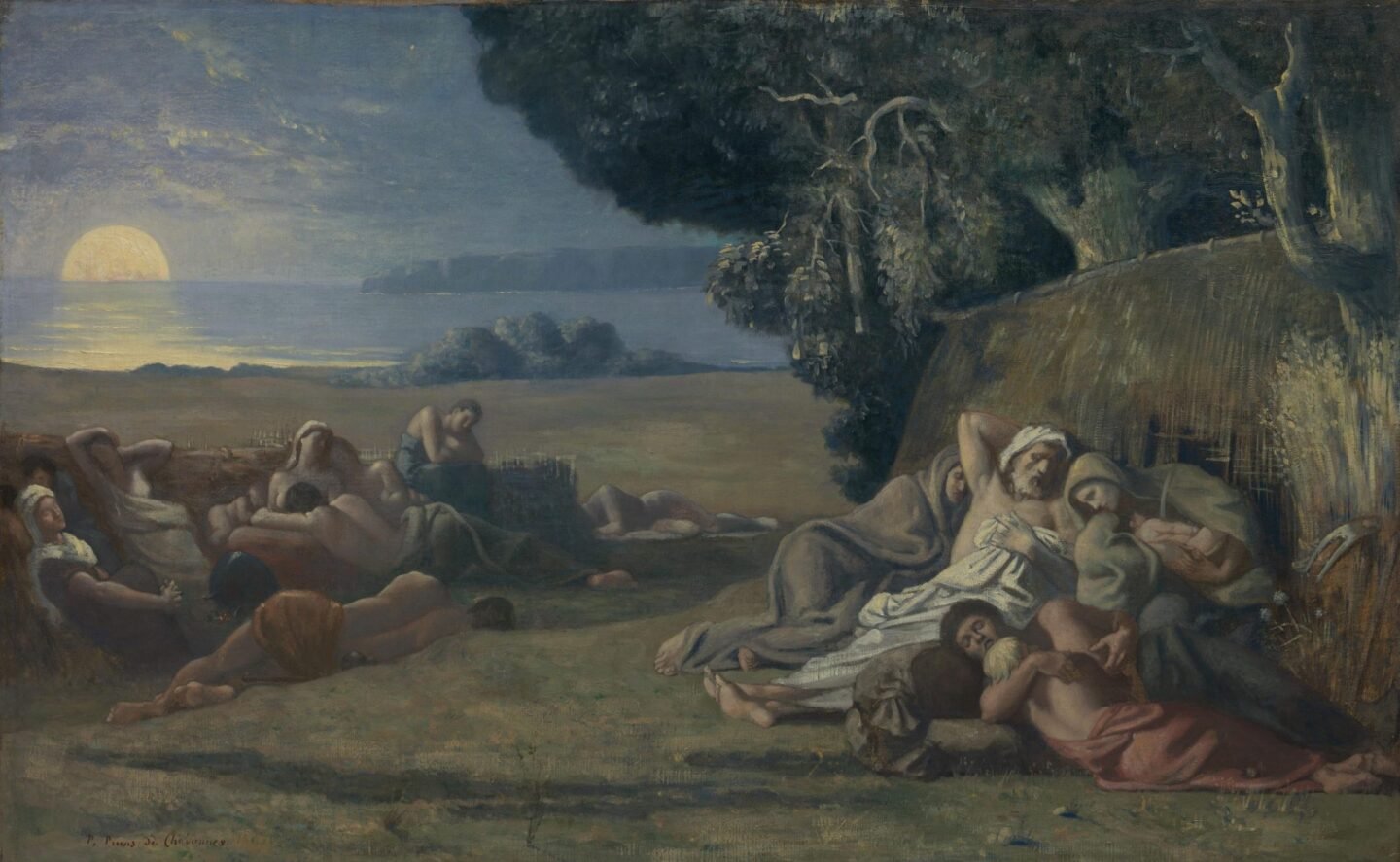 En 1854 y 1855, Puvis de Chavannes realizó frescos y pinturas murales en Amiens y en el Panteón de París. Sus obras son representativas del simbolismo pictórico; tratan temas mayormente fantásticos y alegóricos con figuras de aspecto atemporal pero cuyo primitivismo recuerda a antiguas culturas mediterráneas y a veces también a la Edad Media.