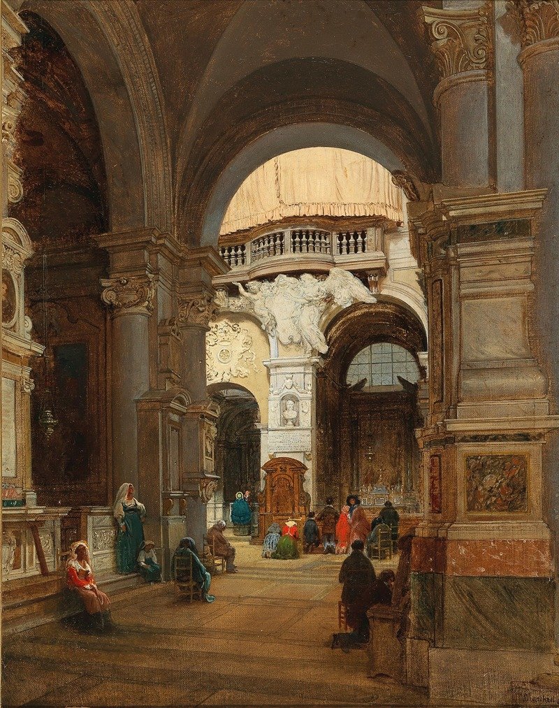 Roma, escena en la iglesia de Santa Maria del Popolo, con la tribuna del órgano y el escudo de Julio II della Rovere al fondo