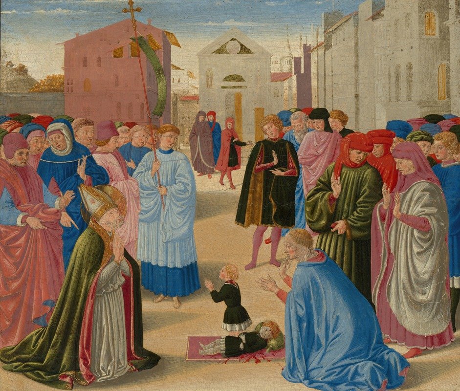 San Zenobio resucitando niño. Esta segunda obra de Benozzo Gozzoli trata milagros del santo patrón de Florencia. El artista se especializó en ciclos narrativos de vidas de santos. La composición detallista caracteriza su estilo. Obra que demuestra capacidad narrativa y amor por detalles anecdóticos del pintor.