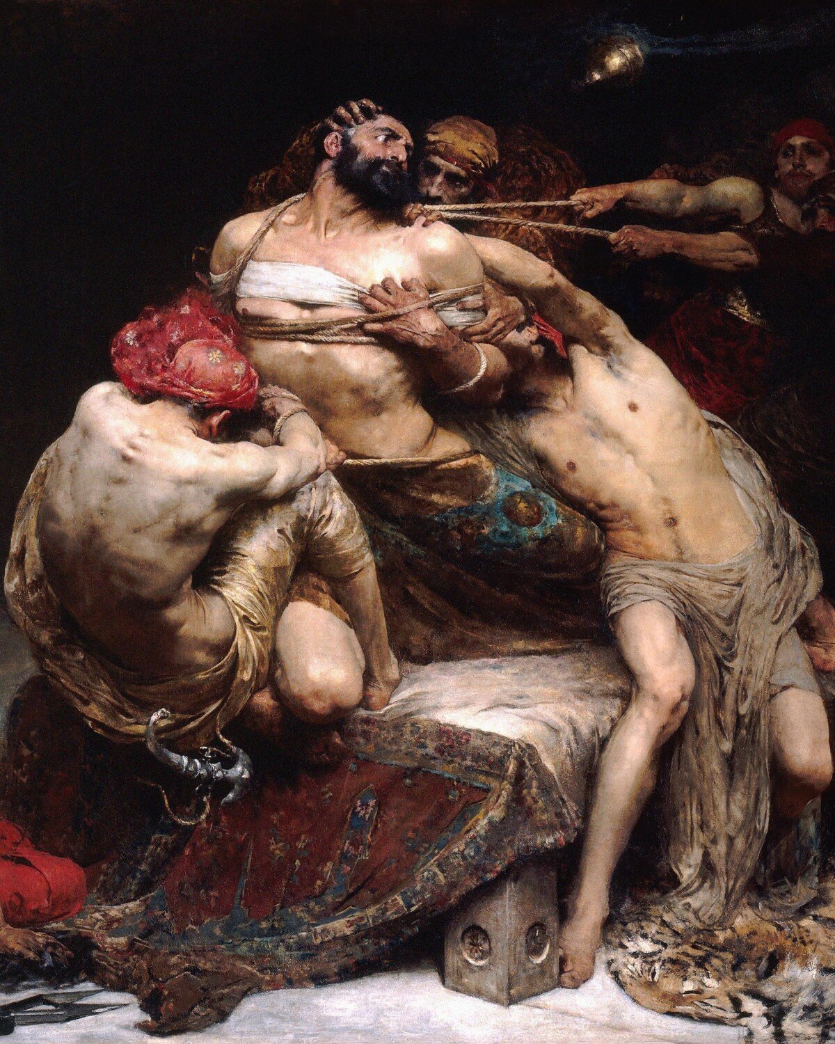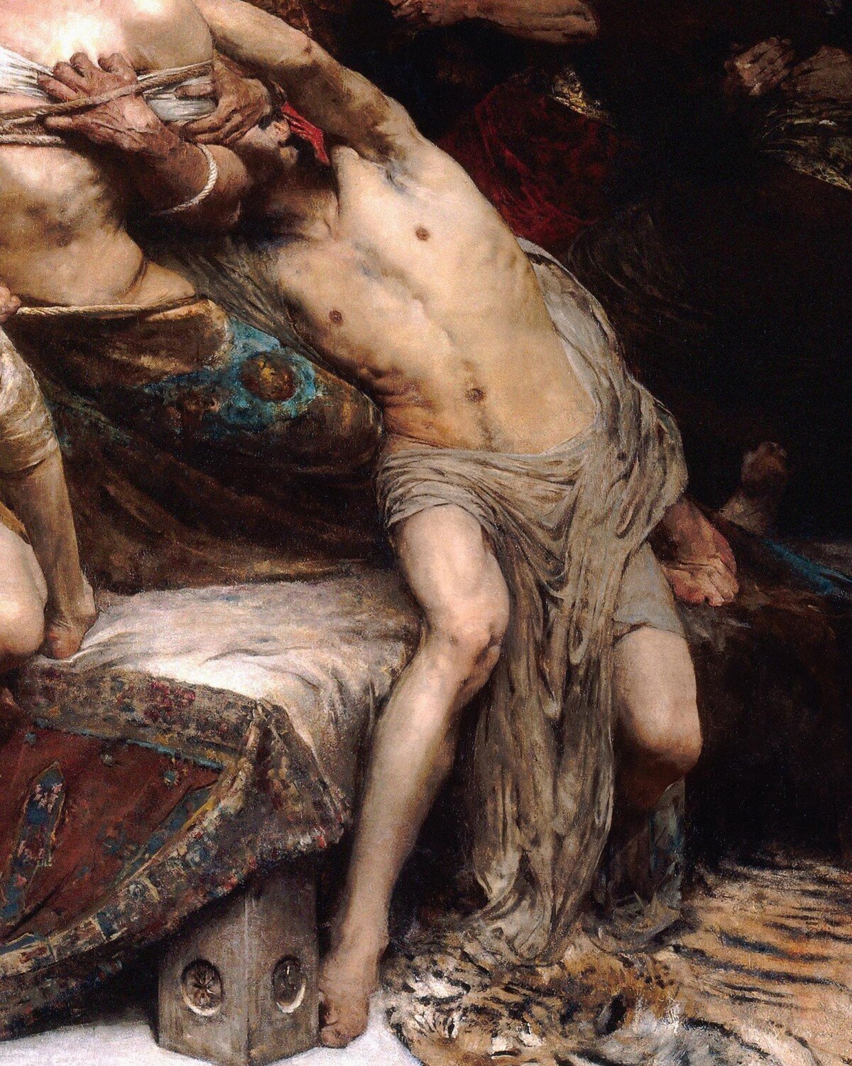 Solomon Joseph Solomon desarrolló su obra dentro de la tradición histórica y simbólica del siglo XIX, con un fuerte interés en el cuerpo humano como narrador de gestas épicas. Su pintura combina el rigor académico con una puesta en escena dramática que busca acercar los relatos antiguos al espectador moderno. En este trabajo, el artista construye una imagen monumental y solemne que transforma la historia en presencia viva, casi teatral, cargada de intensidad emocional.