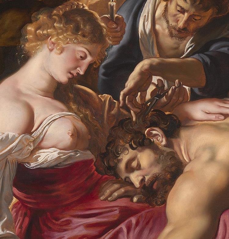 La escena representa el episodio narrado en el Libro de los Jueces (cap. 16): Sansón, célebre por su fuerza extraordinaria, pierde su poder cuando Dalila hace cortar su cabello mientras duerme. Rubens elige el momento previo a la captura, no el castigo. El héroe aún respira, su cuerpo sigue siendo imponente, pero la derrota ya está consumada.