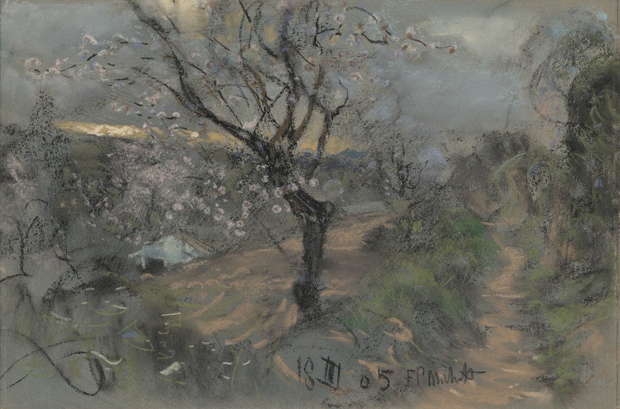Sendero en ladera con cerezos en flor bajo un cielo encapotado (1905)