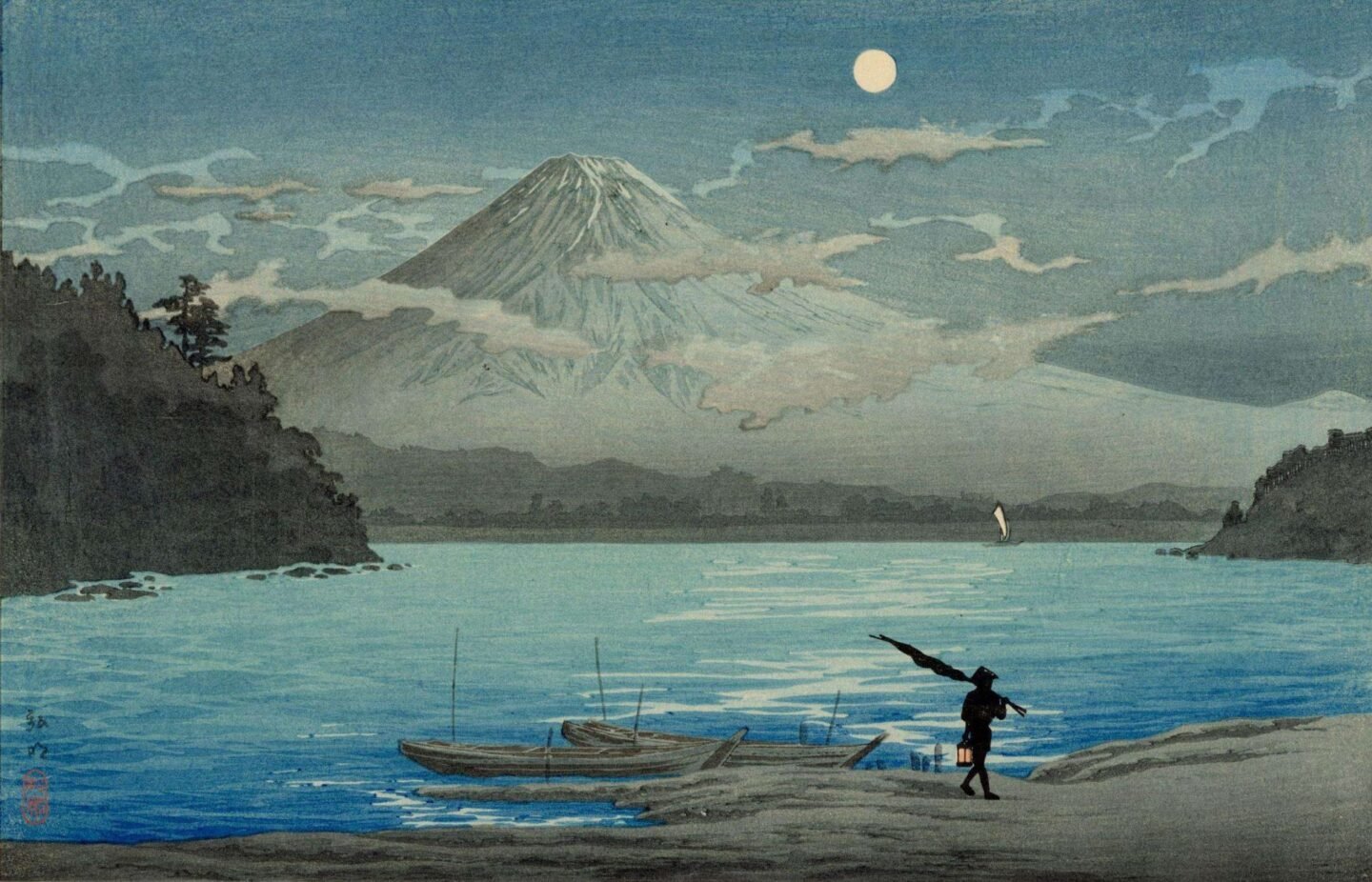 Takahashi Shōtei fue un destacado grabador japonés activo entre fines del siglo XIX y principios del XX, en el periodo de transición entre el ukiyo-e clásico y el shin-hanga, el «nuevo grabado» japonés. Su obra capturó escenas tradicionales del Japón rural —puentes nevados, aldeas en penumbra, faroles bajo la lluvia— con una sensibilidad atmosférica que conectaba lo efímero con lo poético. Aunque su estilo se formó bajo la tradición del ukiyo-e, fue uno de los primeros artistas en integrarse a la editorial de Watanabe Shōzaburō, pionera del shin-hanga, que buscaba renovar el grabado japonés para un público moderno y también occidental. Tras el gran terremoto de Kantō en 1923, Shōtei perdió muchas de sus planchas originales, pero continuó produciendo nuevas obras con gran detalle y refinamiento. Sus grabados siguen siendo apreciados por la delicadeza de la luz y la atmósfera que logra transmitir con apenas unos trazos de color y sombra.