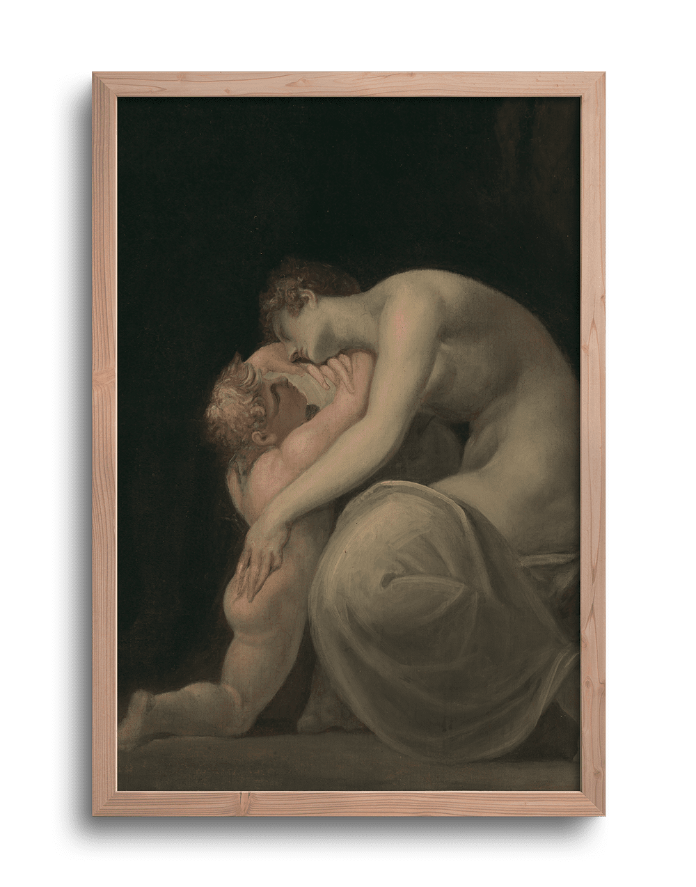 Tekemessa y Eurysakes (c. 1800) representa un momento íntimo de profundo dolor dentro de la tragedia griega: la esposa y el hijo de Áyax descubren el cuerpo del héroe que se ha suicidado. Fuseli encarna aquí el dramatismo teatral que caracteriza su estilo, inspirado por Shakespeare y la tragedia clásica, pero llevado a un extremo emocional propio del prerromanticismo. El juego de luces y sombras sobre los cuerpos convulsos, el espacio oscuro y cerrado, y el gesto exagerado de los personajes reflejan una escena de duelo con fuerza psicológica y casi alucinatoria. No se trata solo de una ilustración mitológica, sino de una exploración del trauma, el destino y el dolor familiar. En tiempos donde Europa transitaba los abismos del fin del siglo ilustrado, las guerras napoleónicas y la irrupción del inconsciente como tema cultural, Fuseli se posicionó como un puente entre lo clásico y lo gótico, entre lo racional y lo onírico. Su figura fue clave en la Royal Academy de Londres y en el desarrollo del imaginario visual del Romanticismo más oscuro.