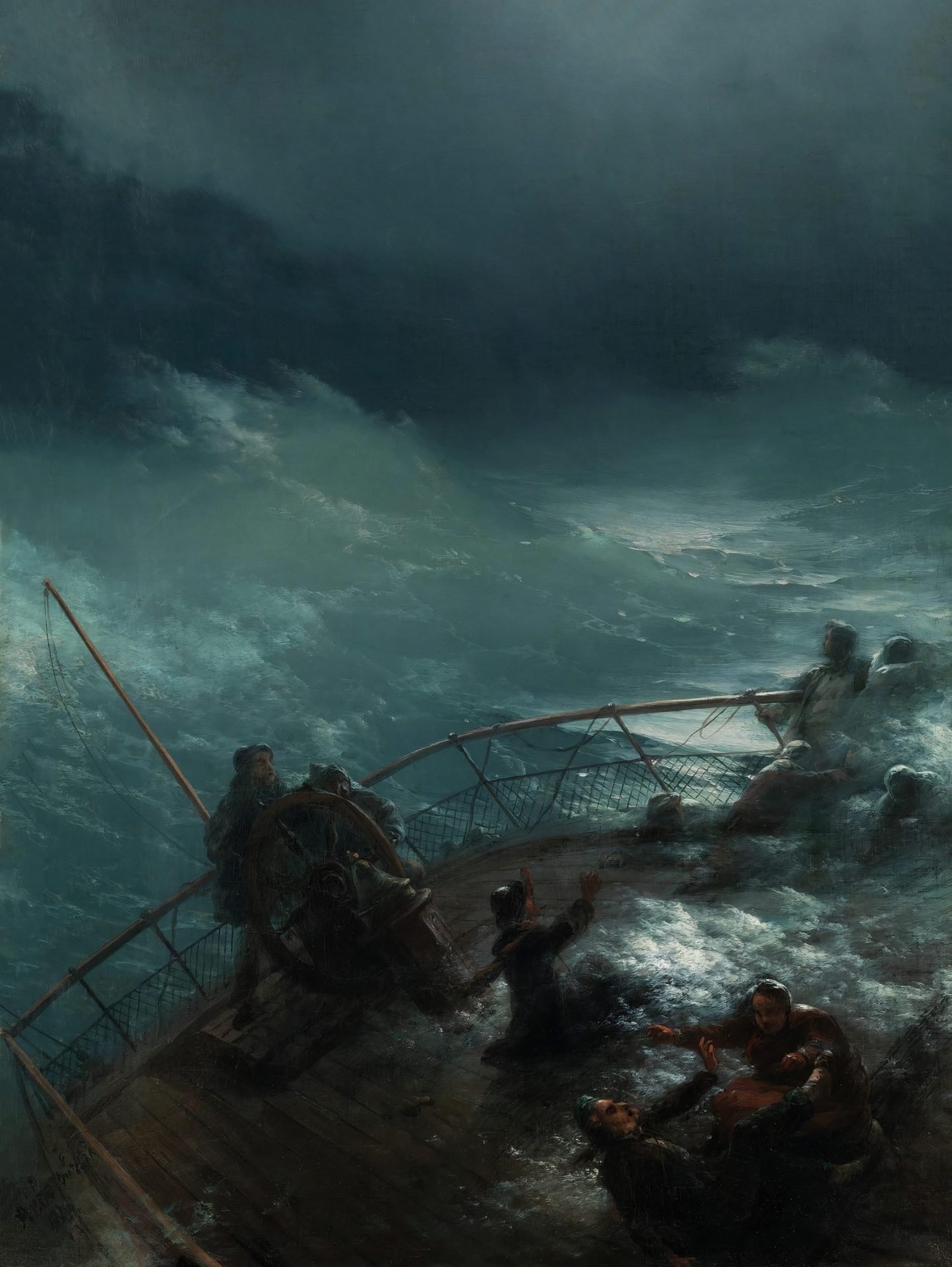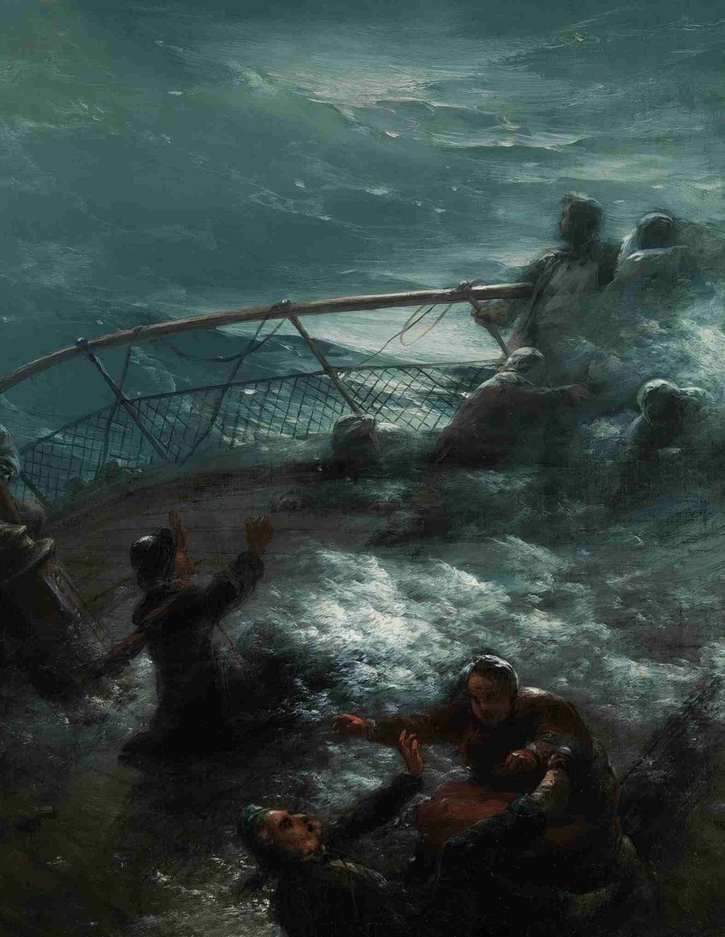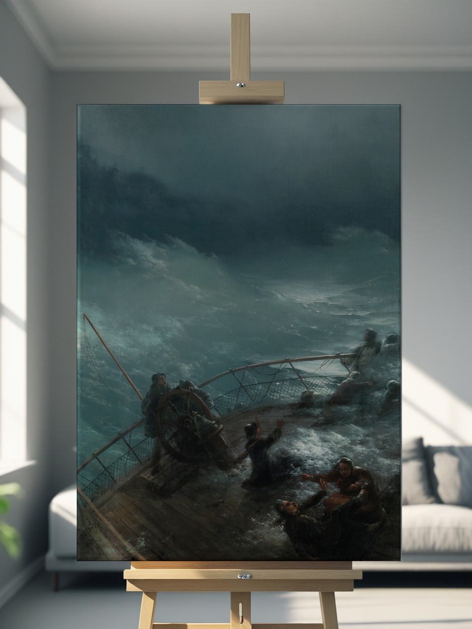 Pintada por uno de los más célebres maestros de la pintura marina del siglo XIX, esta obra captura un instante de lucha desesperada contra la furia del océano. Aivazovsky, reconocido por su virtuosismo en representar el movimiento y la luz del agua, sitúa al espectador en la proa de un barco sacudido por un oleaje nocturno que amenaza con engullirlo. Las figuras, apenas visibles entre la espuma y la penumbra, intentan maniobrar y rescatar a compañeros arrastrados por la fuerza de las olas, mientras el horizonte se pierde en la bruma tormentosa. La composición diagonal, la tensión de las posturas y el contraste entre la negrura del cielo y el fulgor de la espuma transmiten la magnitud del peligro.
