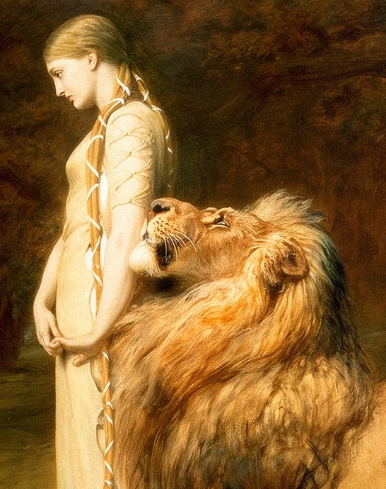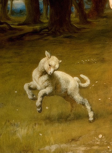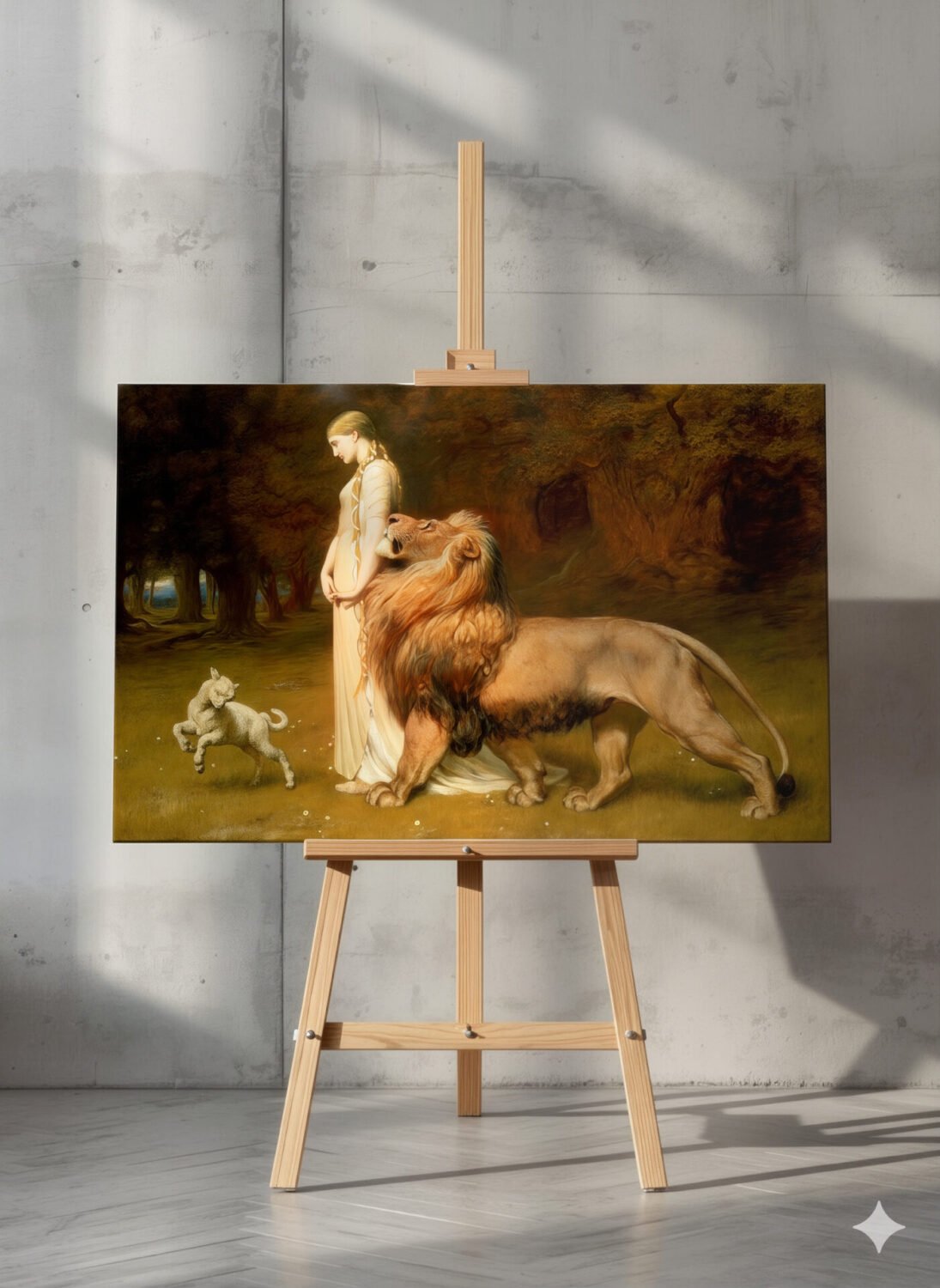La escena representa un episodio de The Faerie Queene de Edmund Spenser, poema alegórico central de la tradición moral inglesa. Una, personificación de la Verdad y la pureza moral, avanza por el bosque acompañada por un león que, lejos de atacarla, se somete a su presencia. La pintura no describe un acto heroico ni un conflicto en desarrollo, sino un orden ya establecido: la fuerza bruta ha sido dominada sin violencia, simplemente por la autoridad ética de la figura femenina. La postura del león —atento, contenido, casi reverencial— refuerza esta idea de poder disciplinado. A su lado aparece una oveja, símbolo tradicional de inocencia y vulnerabilidad, que introduce un contraste fundamental: lo frágil puede existir sin temor cuando la verdad gobierna. La convivencia del león y la oveja no es milagrosa ni fantástica, sino consecuencia directa de un orden moral firme.