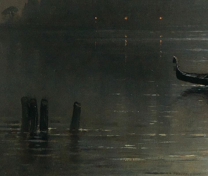 La pintura presenta una Venecia silenciosa, suspendida bajo un cielo oscuro en el que se insinúan reflejos metálicos. Las luces se multiplican en el agua calma, generando un juego de ecos y destellos que invitan al recogimiento. Las figuras, apenas esbozadas, se funden con el entorno: todo parece envuelto en una atmósfera de melancolía nocturna. Más que representar un lugar, la escena sugiere una sensación: la ciudad como sueño, como espacio de evocación íntima y misterio.