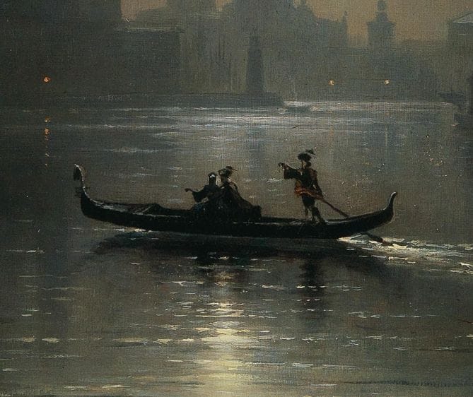 La pintura presenta una Venecia silenciosa, suspendida bajo un cielo oscuro en el que se insinúan reflejos metálicos. Las luces se multiplican en el agua calma, generando un juego de ecos y destellos que invitan al recogimiento. Las figuras, apenas esbozadas, se funden con el entorno: todo parece envuelto en una atmósfera de melancolía nocturna. Más que representar un lugar, la escena sugiere una sensación: la ciudad como sueño, como espacio de evocación íntima y misterio.