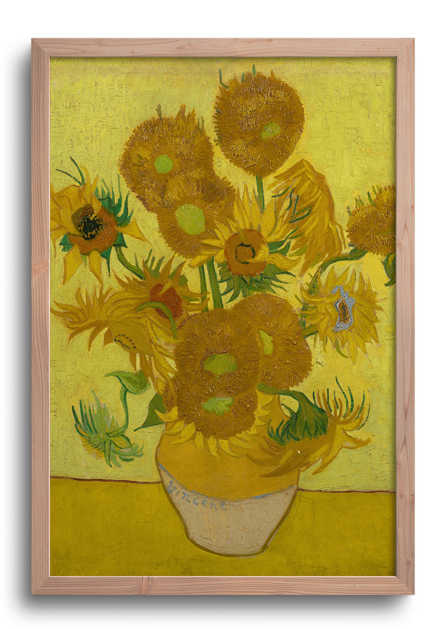 Esta pintura es una de las versiones más conocidas de la serie de girasoles que Van Gogh pintó en Arlés, en el sur de Francia, con el objetivo de decorar la habitación de su amigo Paul Gauguin. El cuadro se destaca por su monocromía desafiante: un estallido de amarillos sobre fondo amarillo, con matices apenas diferenciados que obligan al espectador a captar los detalles a través de la textura, el ritmo y la composición más que por el color. En esta obra, cada flor tiene una personalidad, desde la frescura hasta la decadencia, reflejando un ciclo vital completo.