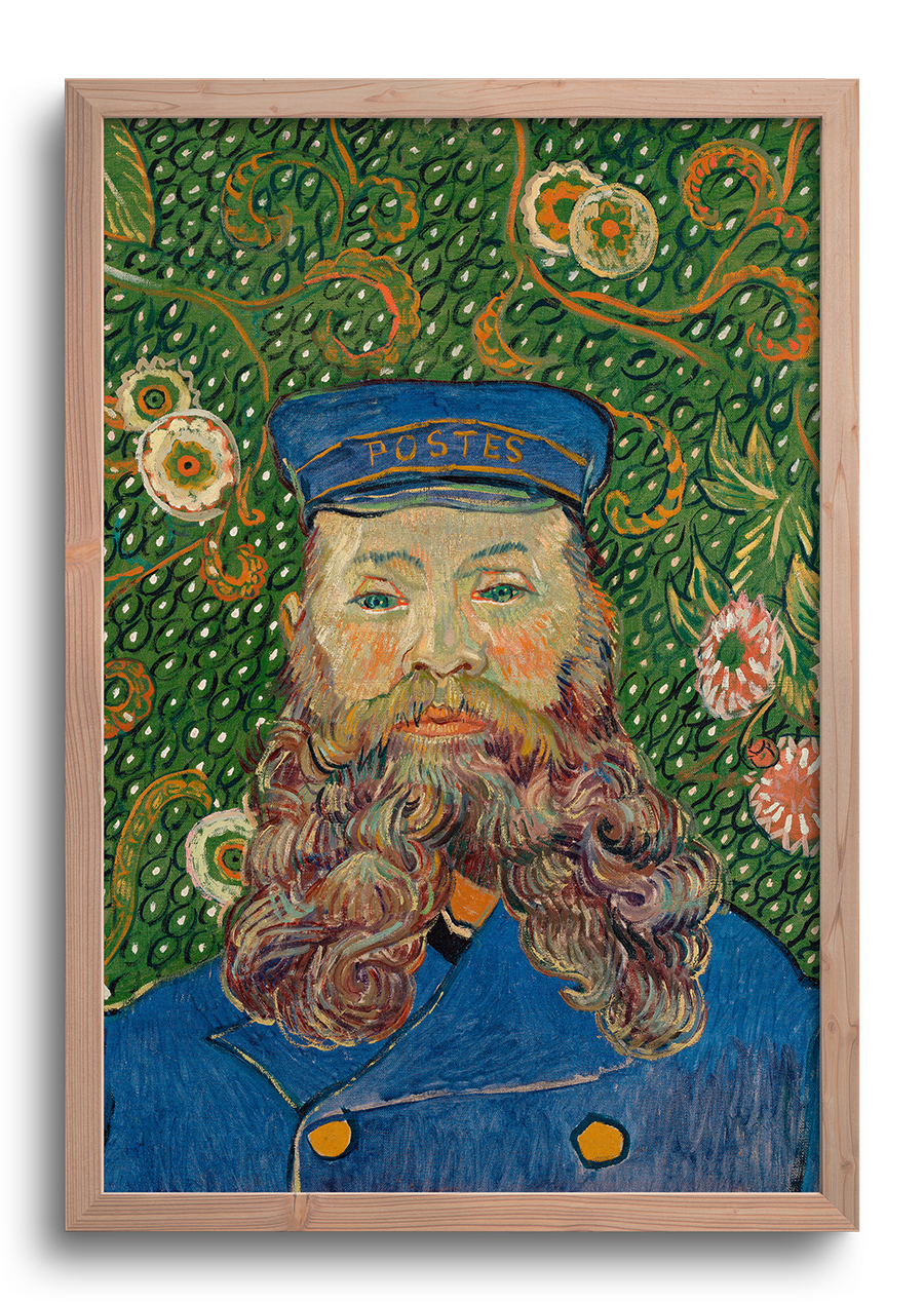Este retrato vibrante es uno de los más célebres de la serie que Van Gogh dedicó a Joseph Roulin, su amigo y cartero en Arlés. Más allá de su rol funcional, Roulin fue un pilar afectivo para el artista durante una etapa de profunda inestabilidad. Van Gogh eligió retratarlo no con realismo fotográfico, sino con una fuerza expresiva y cromática que transformó la imagen de un trabajador común en la de una figura casi iconográfica. Su barba ondulante parece una extensión viva del fondo vegetal que lo rodea, y el uniforme azul contrasta con el verde orgánico, creando una tensión visual intensa.