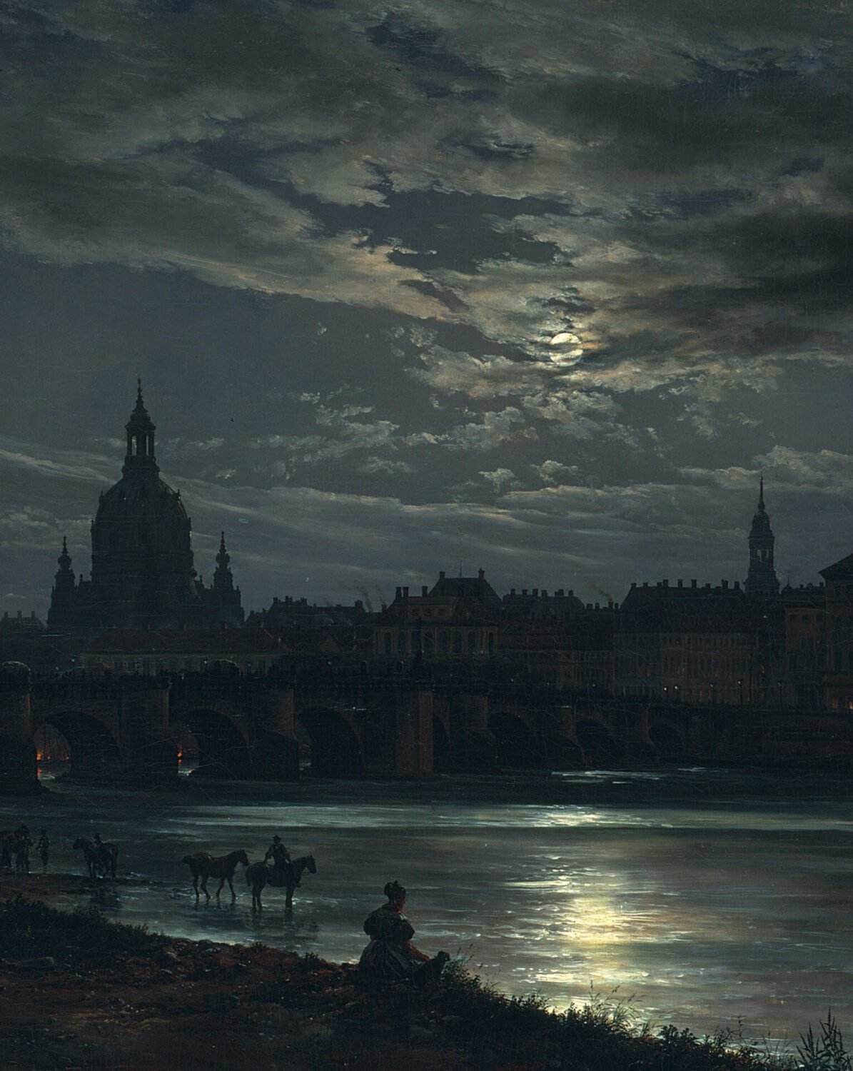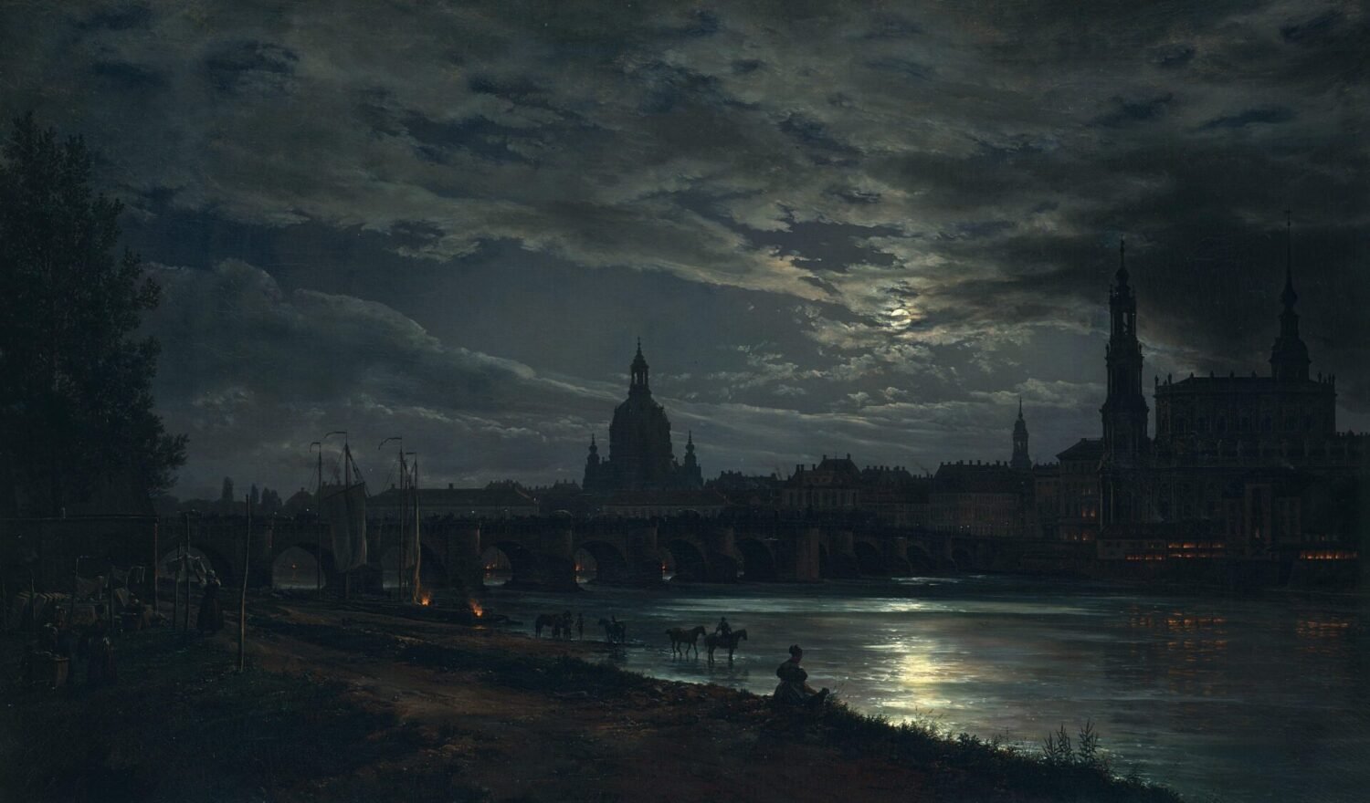 La escena presenta a Dresde extendida a lo largo del río Elba bajo una noche clara y estable, donde la luna actúa menos como foco dramático que como regulador del espacio. Su luz, filtrada por un cielo nuboso, no irrumpe: estructura. Ordena la arquitectura, define el curso del agua y establece una continuidad entre ciudad, río y atmósfera. No hay episodios humanos reconocibles ni gestos narrativos; la ciudad aparece casi detenida, reducida a siluetas y reflejos. El protagonismo no está en los edificios ni en el cielo, sino en la relación entre ambos mediada por la luz. El paisaje urbano se vuelve así un estado de equilibrio, donde la noche no introduce inquietud sino una forma de claridad silenciosa.