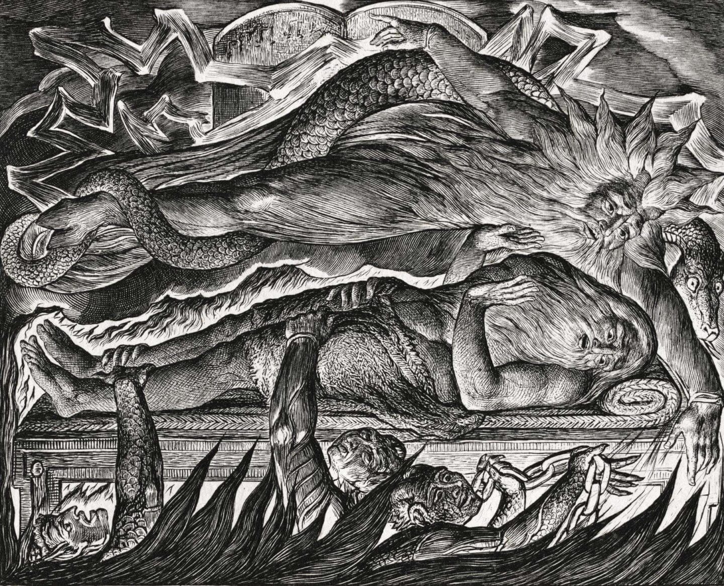 En sus pinturas, Blake exploró temas mitológicos, bíblicos y sociales. Su serie de ilustraciones para «The Book of Job» y «Paradise Lost» revelan su habilidad para capturar lo divino y lo humano en una única imagen. Su obra maestra, «The Ancient of Days», es una representación icónica de un anciano divino extendiendo una brújula sobre el mundo, simbolizando la creación y el orden.