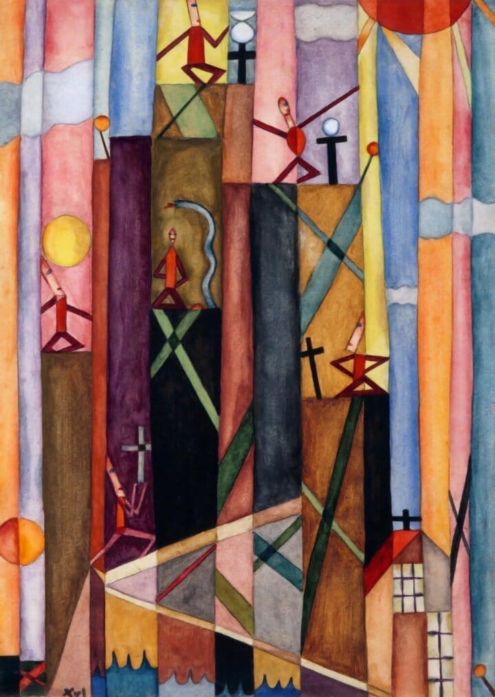 Además de su obra plástica, Xul Solar fue un inventor de lenguas (como el neocriollo), creador de sistemas de escritura y diseñador de juegos, lo que lo posiciona como una figura multifacética en la vanguardia cultural de América Latina. Su interés por la astrología, la cábala, las religiones orientales y las tradiciones precolombinas se refleja en su arte, que invita al espectador a adentrarse en un viaje introspectivo y trascendental. Colaborador cercano de figuras como Jorge Luis Borges, Xul Solar dejó un legado que combina la visión utópica de un mundo unificado con una sensibilidad profundamente enraizada en las tradiciones y la espiritualidad latinoamericana.