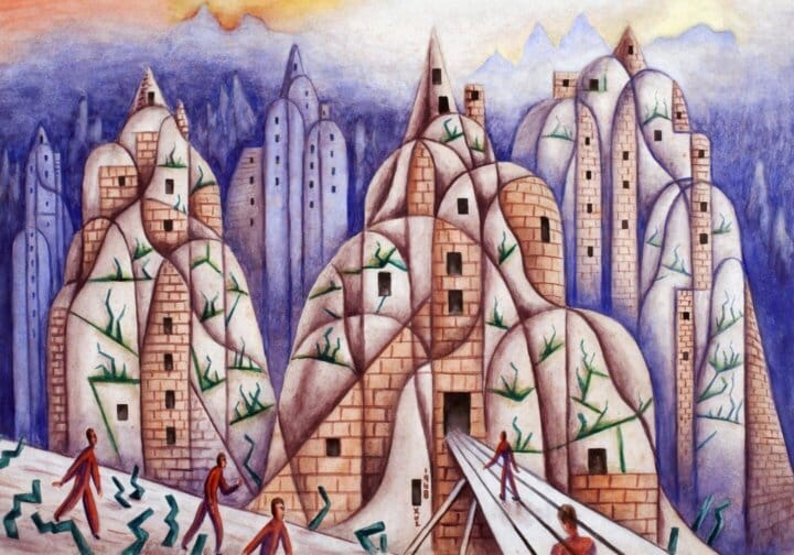 Xul Solar (1887-1963), nacido como Oscar Agustín Alejandro Schulz Solari, fue un pintor, escultor, músico, poeta e inventor argentino, cuya obra es un crisol de influencias místicas, filosóficas y culturales. Su estilo único, profundamente personal, fusiona elementos del simbolismo, el surrealismo y el cubismo, creando un universo visual cargado de significados esotéricos y espirituales. Obras como «Pan-Chess» y «Vuel Villa» ejemplifican su capacidad para entrelazar formas arquitectónicas fantásticas, paisajes cósmicos y símbolos inventados, generando un lenguaje pictórico que trasciende las fronteras tradicionales del arte.